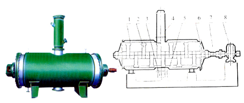 1、壳体 2、耙齿 3、出料装置 4、加料装置 5、粉碎棒 6、密封装置 7、搅拌轴 8 、传动装置